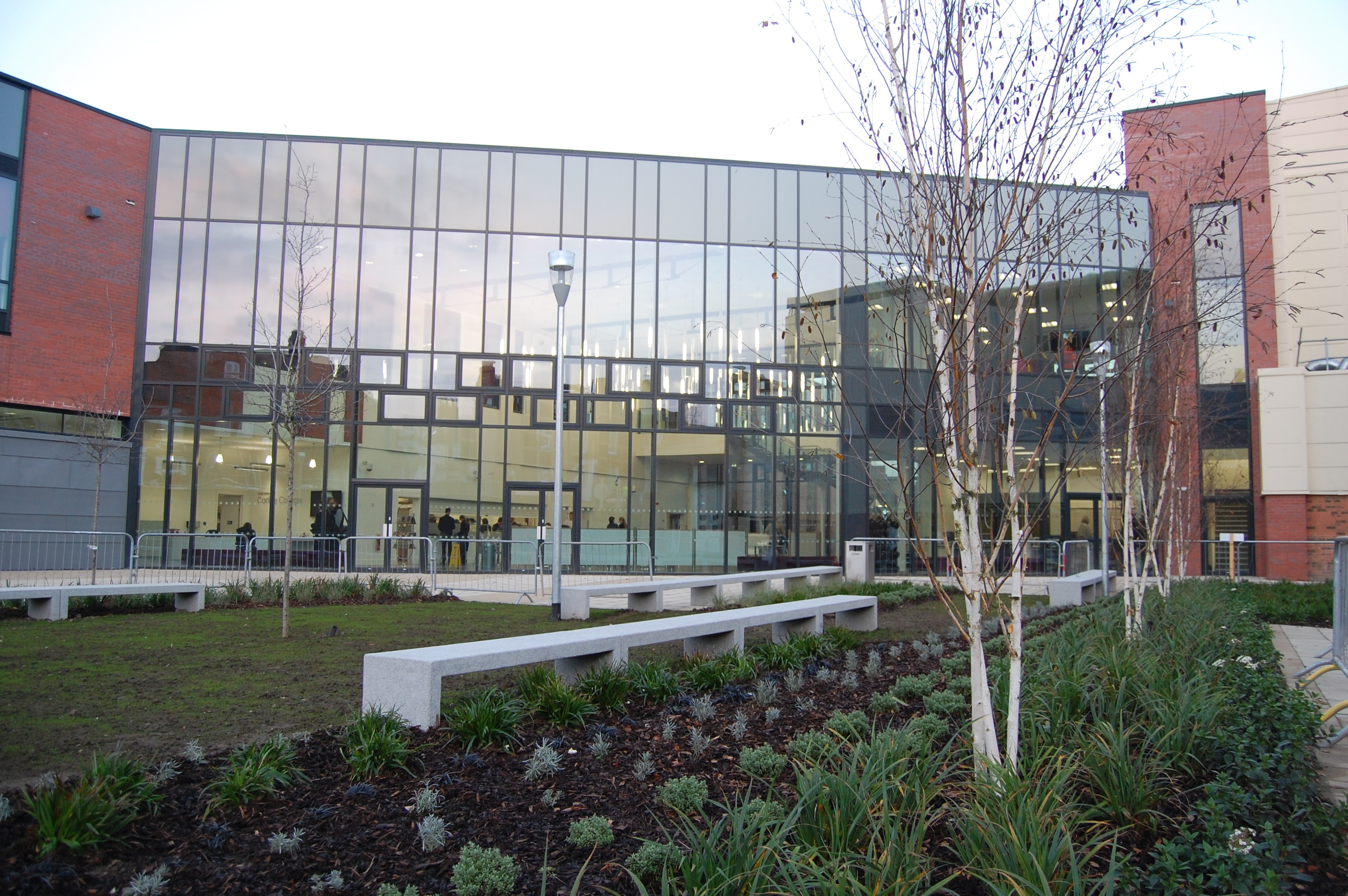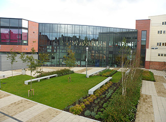 An inspirational landscape setting was required for students, staff and visitors of this new build college incorporating seating areas set within bold planting displays with year round colour, texture and scent. Semi mature trees were planted within the paved courtyard with specialised tree pits and resin bound paving.