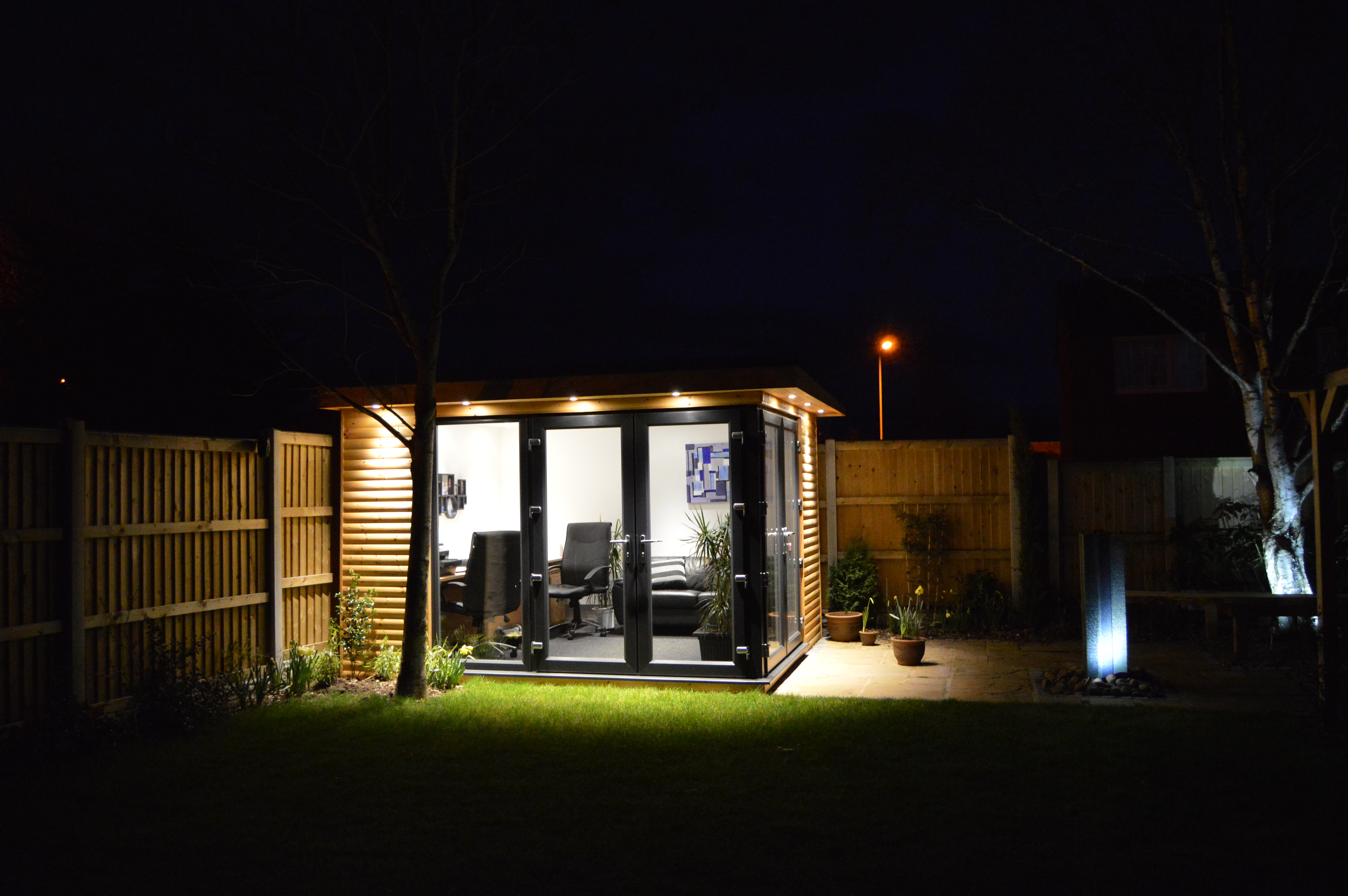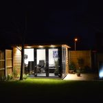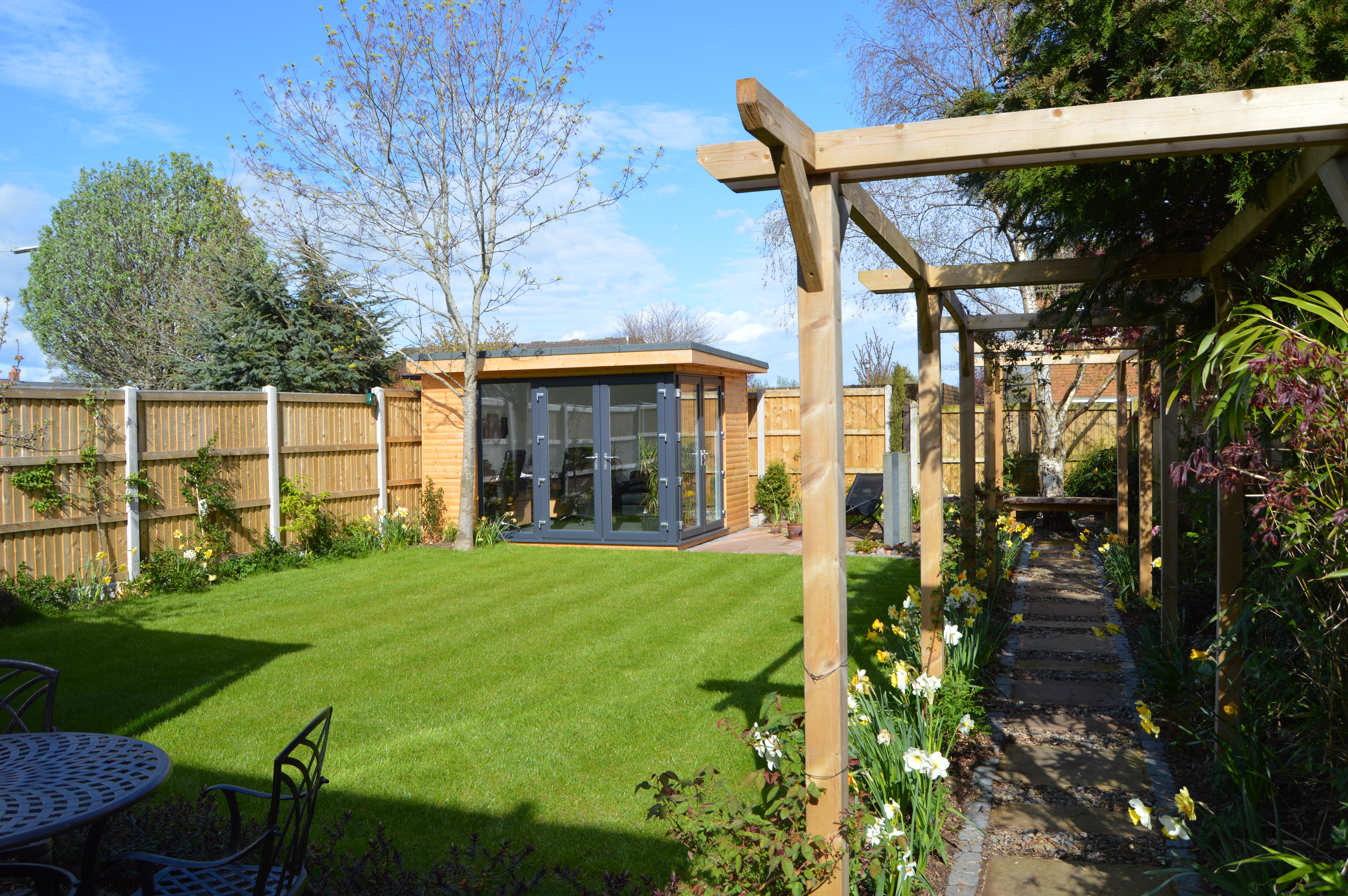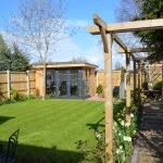 This garden maximised the space available by creating an office and retaining a good sized garden. The planting and water feature are enhanced with LED lights to extend the display. Natural stone paving was used on two patios with stepping stones to the walkway
