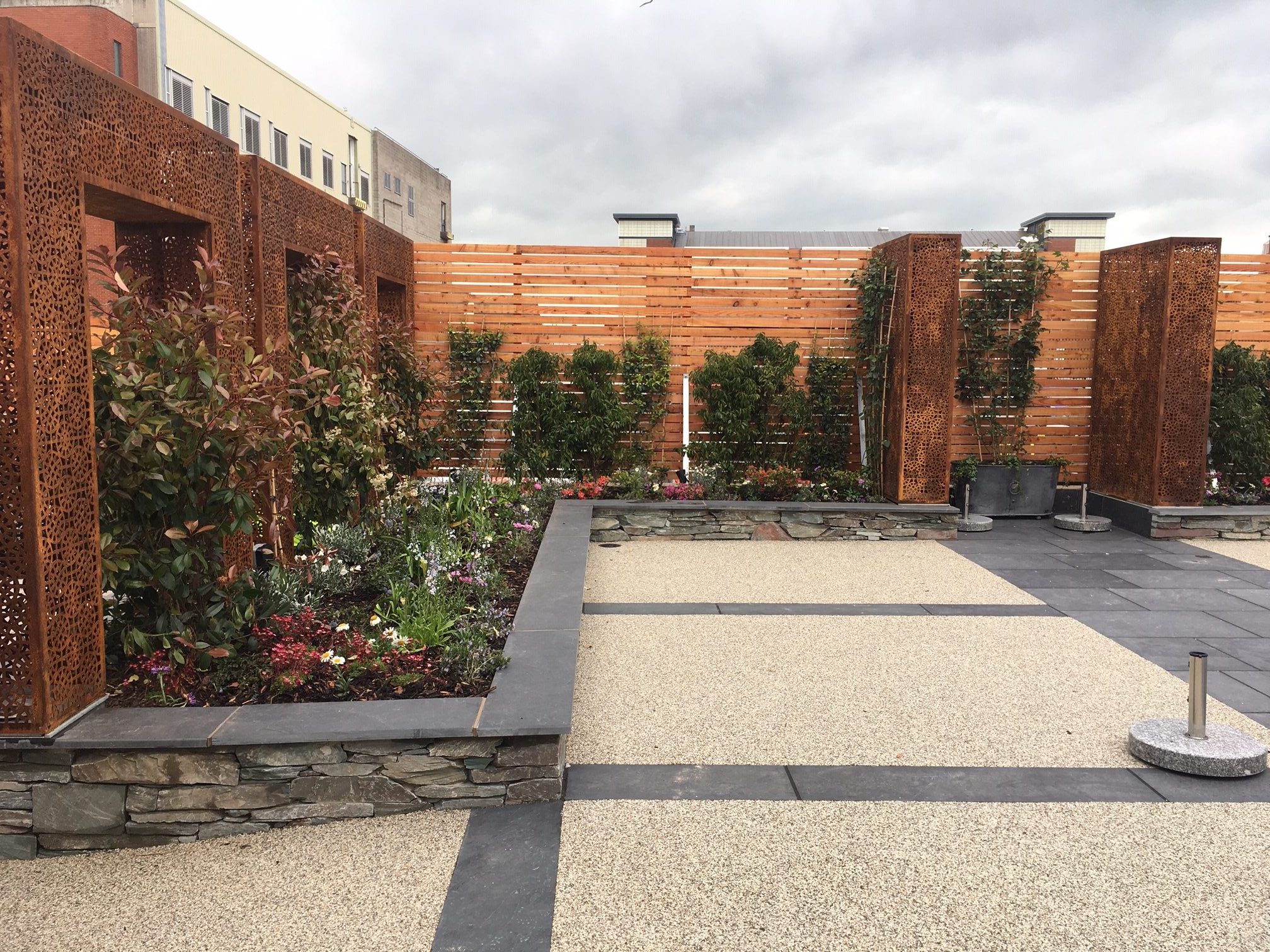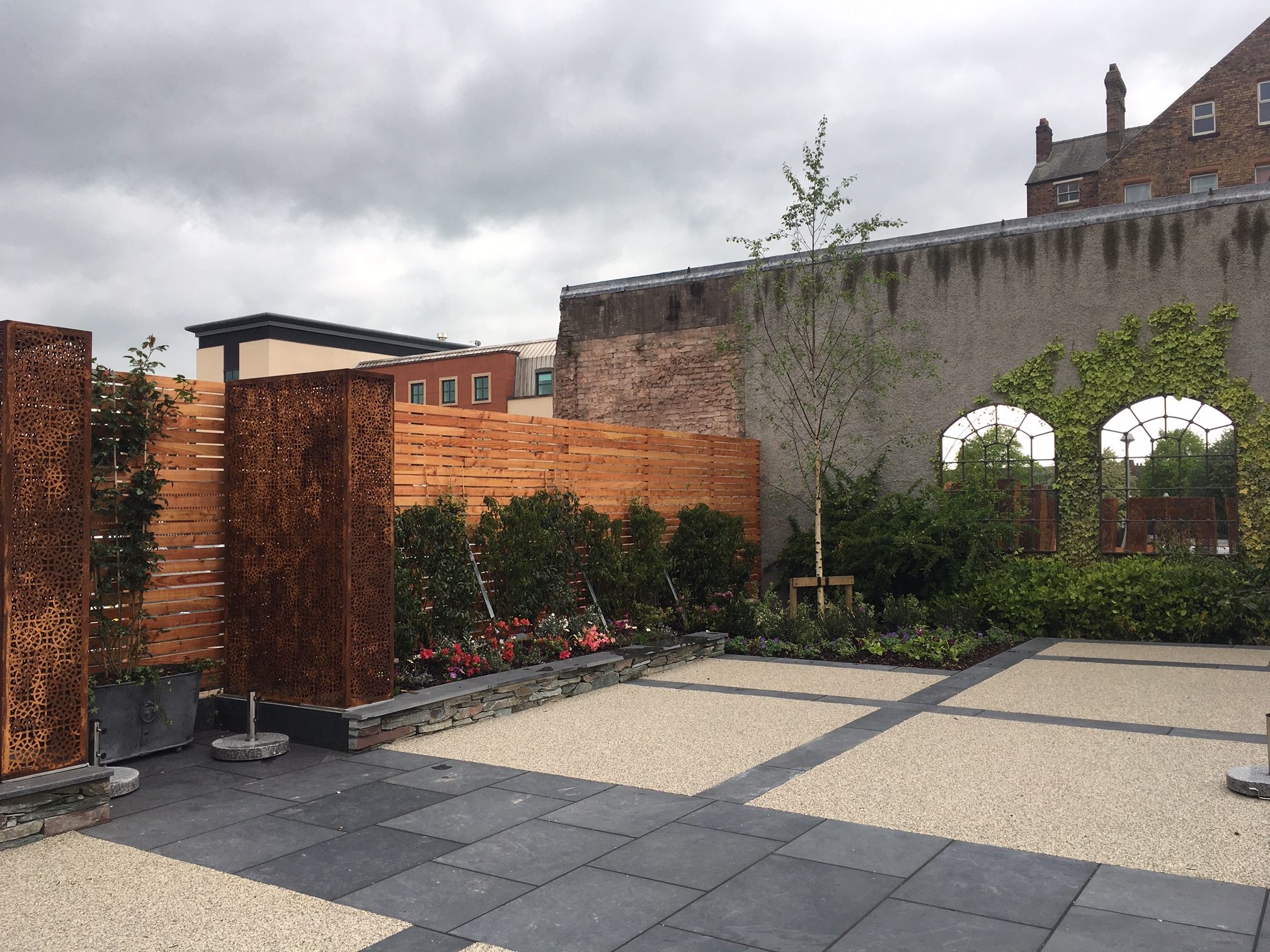 Westwood Landscape assisted the client at the Halston Hotel to design an enclosed courtyard garden for weddings and other functions to extend the facilities of the hotel. Features include corten steel trellis arches, dining terrace, wedding arbour seat with scented roses and raised beds to provide informal seating