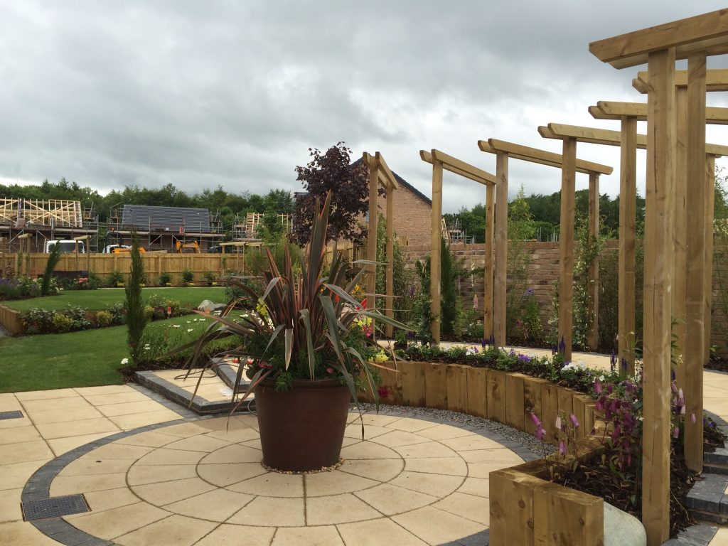 Design and build project of a linking show garden across the rear of two properties highlighting the possibilities in different size gardens. They both incorporate pergolas, raised planting beds with training planting, large statement pots and lawn areas. The front gardens showcase the properties with seasonal hanging baskets and specimens planting to the boundary.